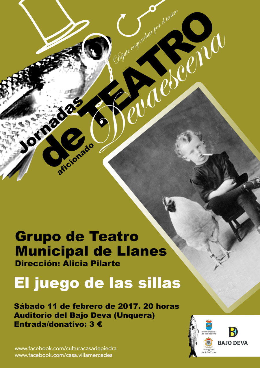 Grupo Municipal de Teatro de Llanes 11 de febrero de 2017. 20,00 h. El juego de las sillas (varios autores). Grupo Municipal de Teatro de Llanes. Auditorio del Bajo Deva. Unquera (Cantabria). Entrada-donativo 3€. Ejercicio actoral s… Origen: Grupo Municipal de Teatro de Llanes Comparte esto: Compartir en X (Se abre en una ventana nueva) X Comparte en Facebook (Se abre en una ventana nueva) Facebook Me gusta Cargando...