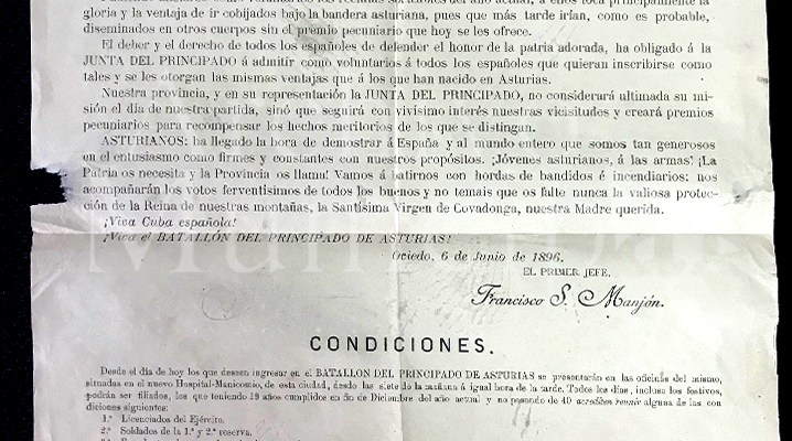 Este documento impreso fechado el 6 de junio de 1896 abunda en el que publicamos con anterioridad con la misma idea de animar al alistamiento para la creación del conocido como el Batallón de Voluntarios del Principado de Asturias destinado a la defensa de la Isla de Cuba. Si el anterior documento estaba firmado por el presidente de la Comisión Organizadora de este batallón, Ramón Argüelles, este lo firma Francisco Sánchez-Manjón del Busto «nacido de padres asturianos en Guantánamo (Cuba), que viaja al frente del batallón el 21 de septiembre de 1896 en tren especial hasta Gijón, donde el mismo día embarca, en medio de una despedida apoteósica, en el vapor “Ciudad de Cádiz” con rumbo a Cuba» (más información en La presencia de Asturias en la Guerra de Cuba. Francisco Ramos Oliver. En Boletín del RIDEA nº 158 pp. 183-199)