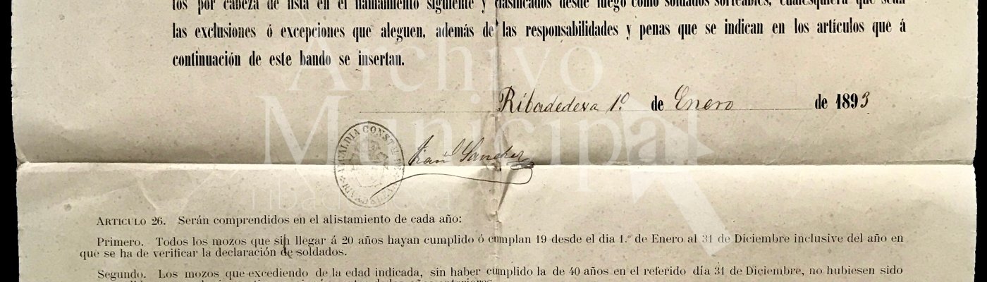 Este documento fechado el 1 de enero de 1893 anuncia la convocatoria a los jóvenes de 18 ó 19 años -o mayores que nos hayan sido alistados con anterioridad- para que se reúnan en el ayuntamiento con el objeto proceder a su alistamiento para el sorteo a quintas. El documento -que es un modelo que cada ayuntamiento personaliza con sus datos- en este caso está firmado por el entonces alcalde Francisco Sánchez Escalante. El sello usado son las armas del escudo nacional.