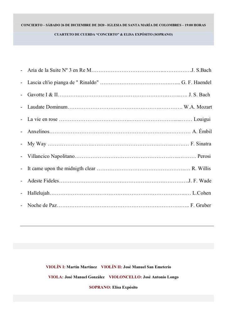 El sábado 26 de diciembre a las 19,00 h. la Iglesia de Santa María de Colombres acoge un Concierto de Navidad a cargo del Cuarteto de Cuerda «Concerto» acompañado de la soprano Elisabeth Expósito con entrada libre hasta llenar el aforo de la sala, que será limitado por los protocolos COVID.