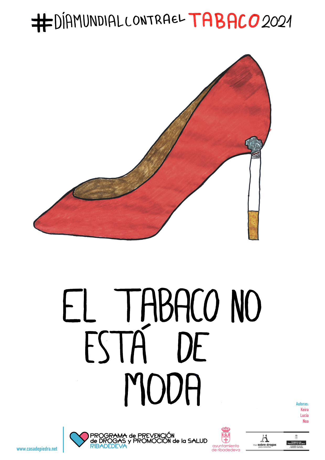 Este año el cartel ha sido diseñado por Keira, Noa y Lucía dentro del programa de participación juvenil Espacio Abierto y recoge una llamativa imagen que hace referencia a su lema: EL TABACO NO ESTÁ DE MODA.