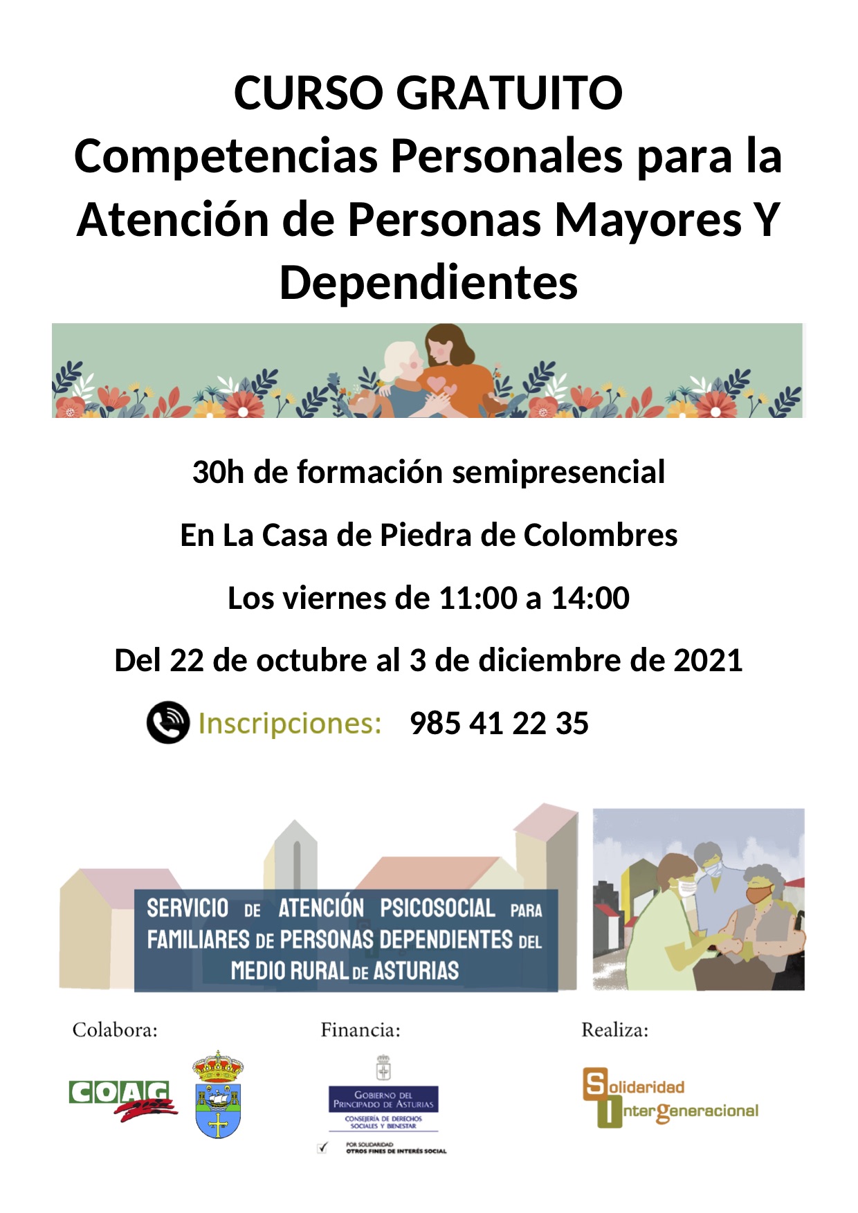 Solidaridad Intergeneracional, en colaboración con el Ayuntamiento de Ribadedeva, organiza dentro de su programa “Servicios para incentivar la empleabilidad de las mujeres del medio rural” un Curso gratuito de formación para conseguir la curso de Competencias Personales para la Atención de Personas Mayores Y Dependientes en Colombres.