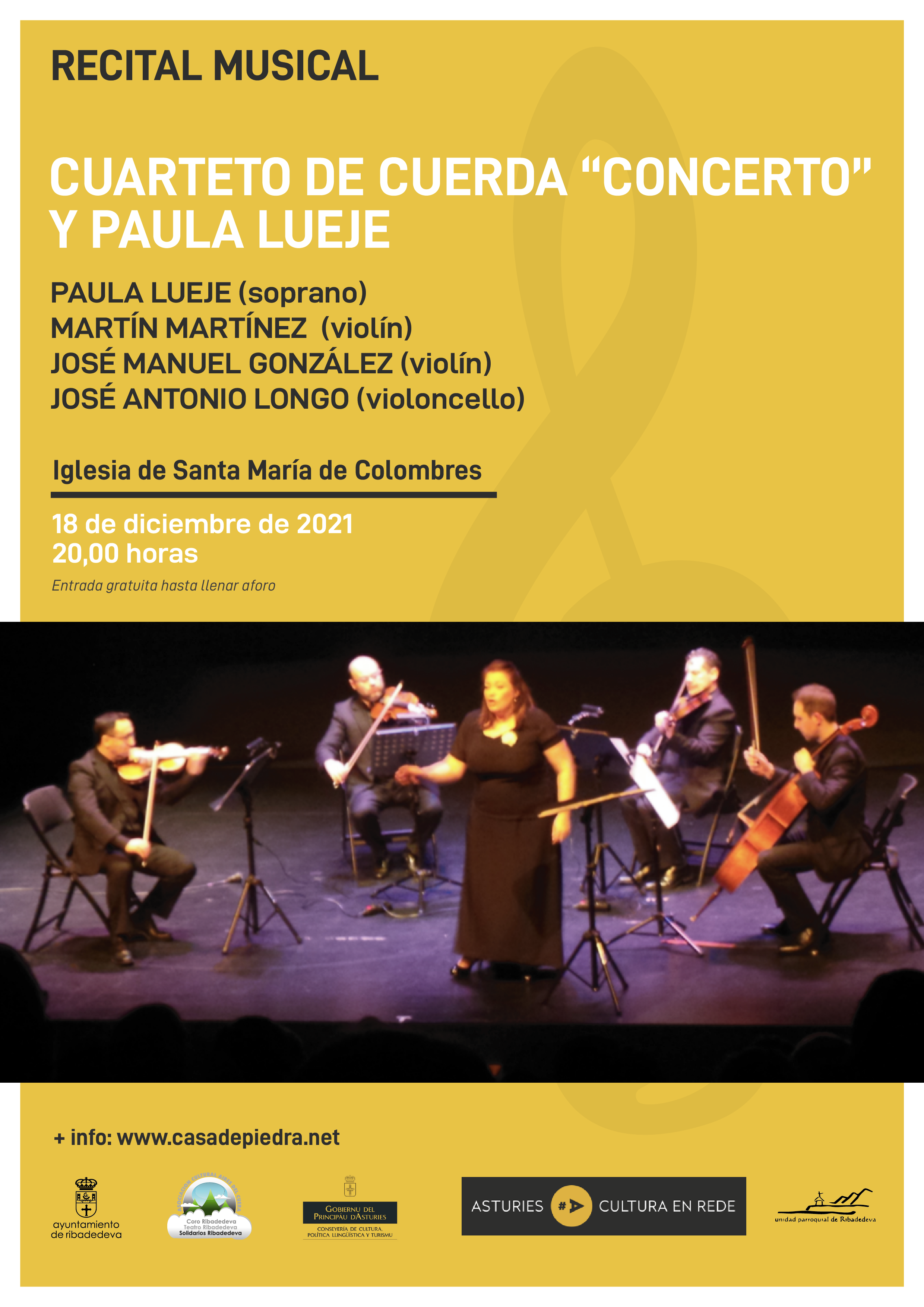 El próximo sábado 18 de diciembre a las 20,00 h. la Iglesia de Santa María de Colombres acoge un recital a cargo del cuarteto de cuerda asturiano «Concerto» acompañado de la soprano Paula Lueje organizado por el Ayuntamiento de Ribadedeva dentro del programa Asturias Cultura en Rede subvencionado por el Principado de Asturias y con la colaboración del Coro Ribadedeva . La entrada al concierto es libre hasta llenar el aforo de la sala.