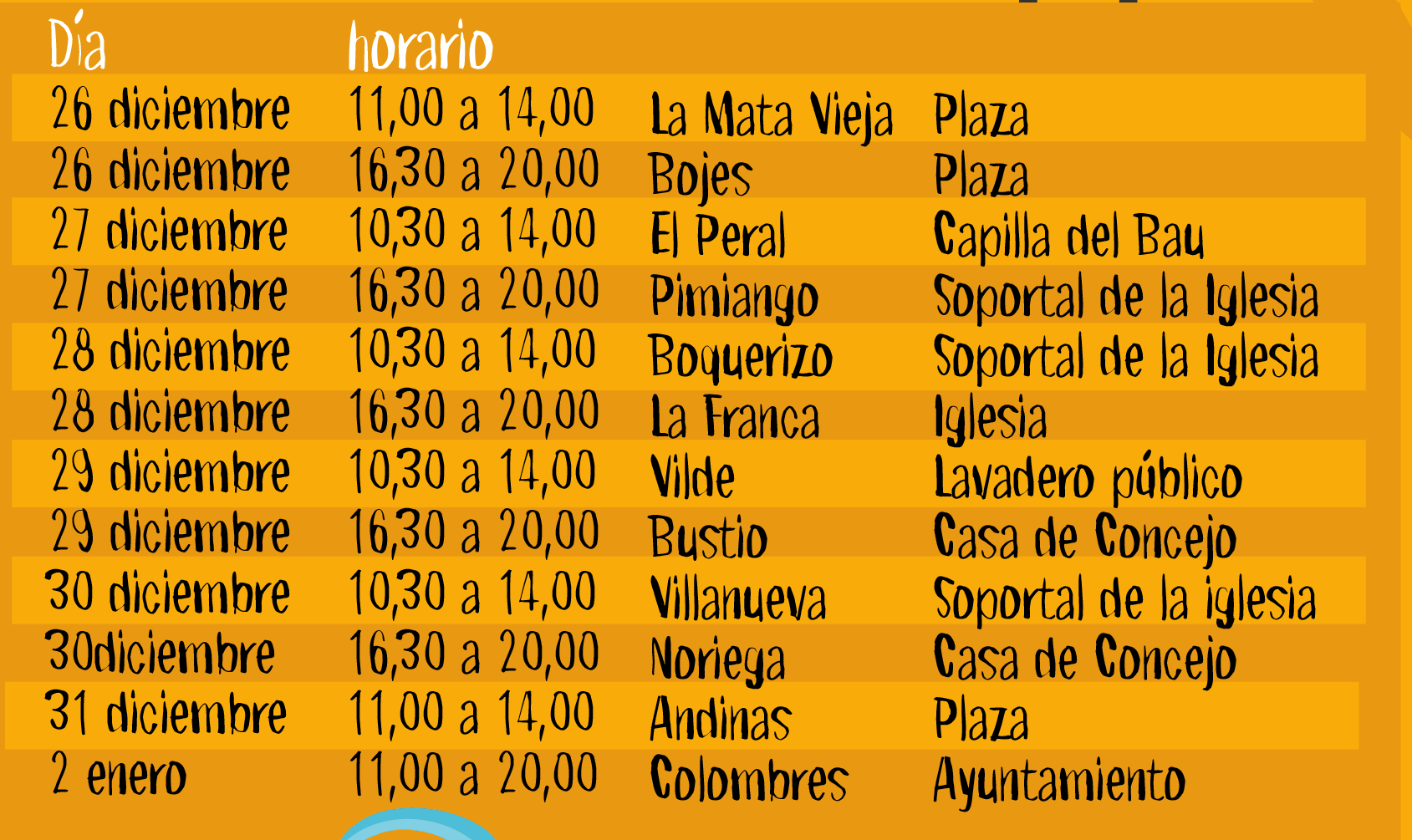 Los horarios y días previstos de colocación del buzón en cada uno de los pueblos del municipio son:
