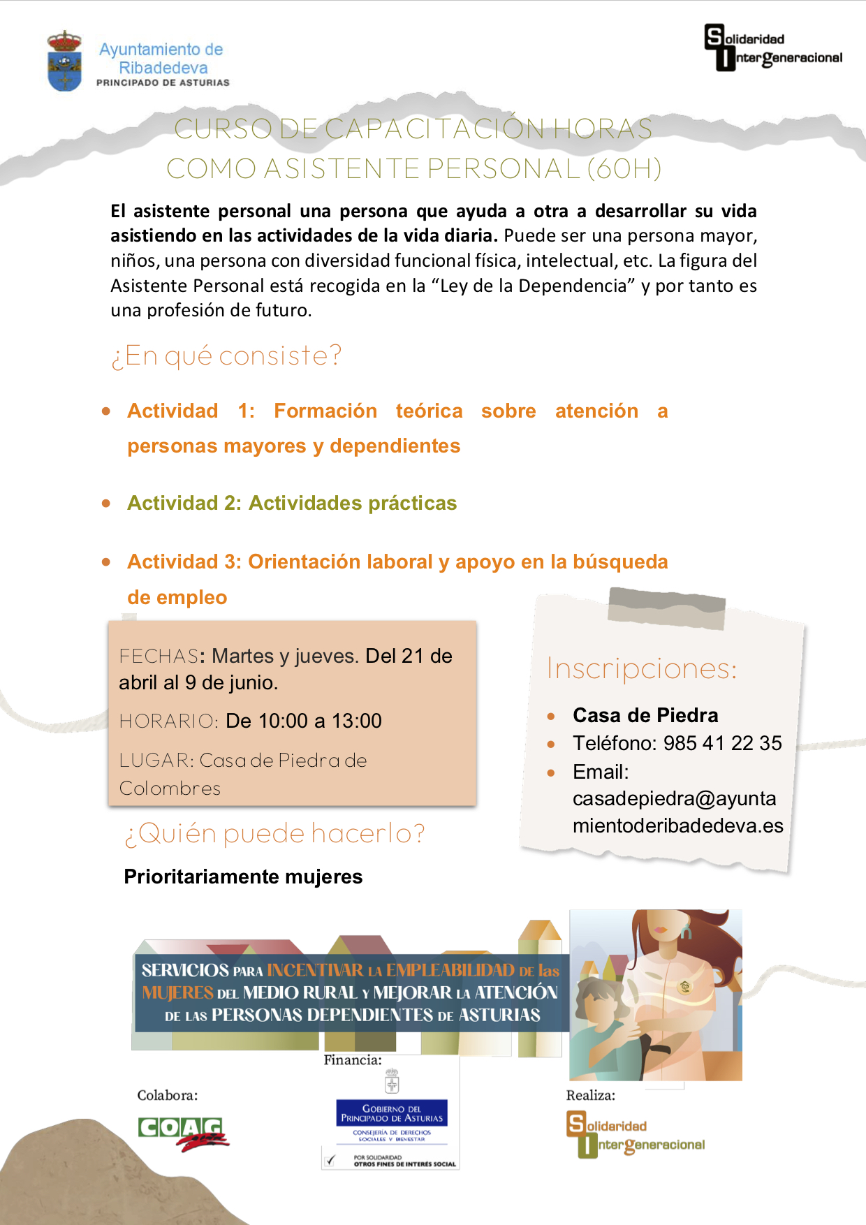 Solidaridad Intergeneracional, en colaboración con el Ayuntamiento de Ribadedeva, organiza dentro de su programa “Servicios para incentivar la empleabilidad de las mujeres del medio rural” un Curso gratuito de formación para conseguir la CAPACITACIÓN COMO ASISTENTE PERSONAL en la Casa de Piedra de Ribadedeva.