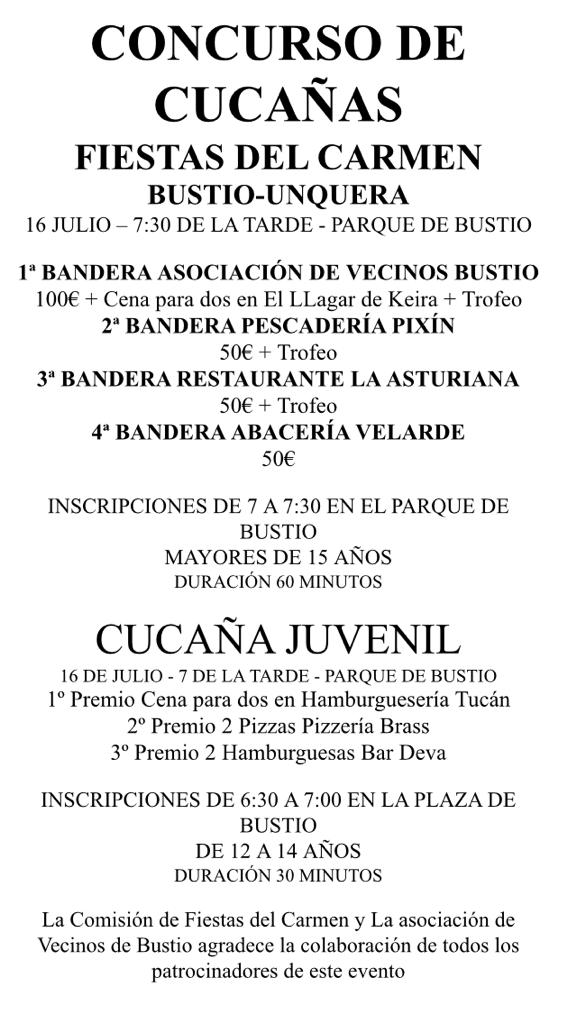 A las 19,00 h. se hará un recorrido musical por los bares de Bustio y Unquera, mientras que a las 19,30 h. tendrá lugar el concurso de cucañas, que contará con diferentes premios. Este será uno de los platos fuertes de la fiesta, ya que se recuperará después de años sin organizarse. La divertida y refrescante competición se llevará a cabo en el parque de la Remansona con una categoría juvenil de 12 a 14 años y la destinada a mayores de 15 años. Las inscripciones habrán de formalizarse en la misma ubicación desde las 18,30 h.