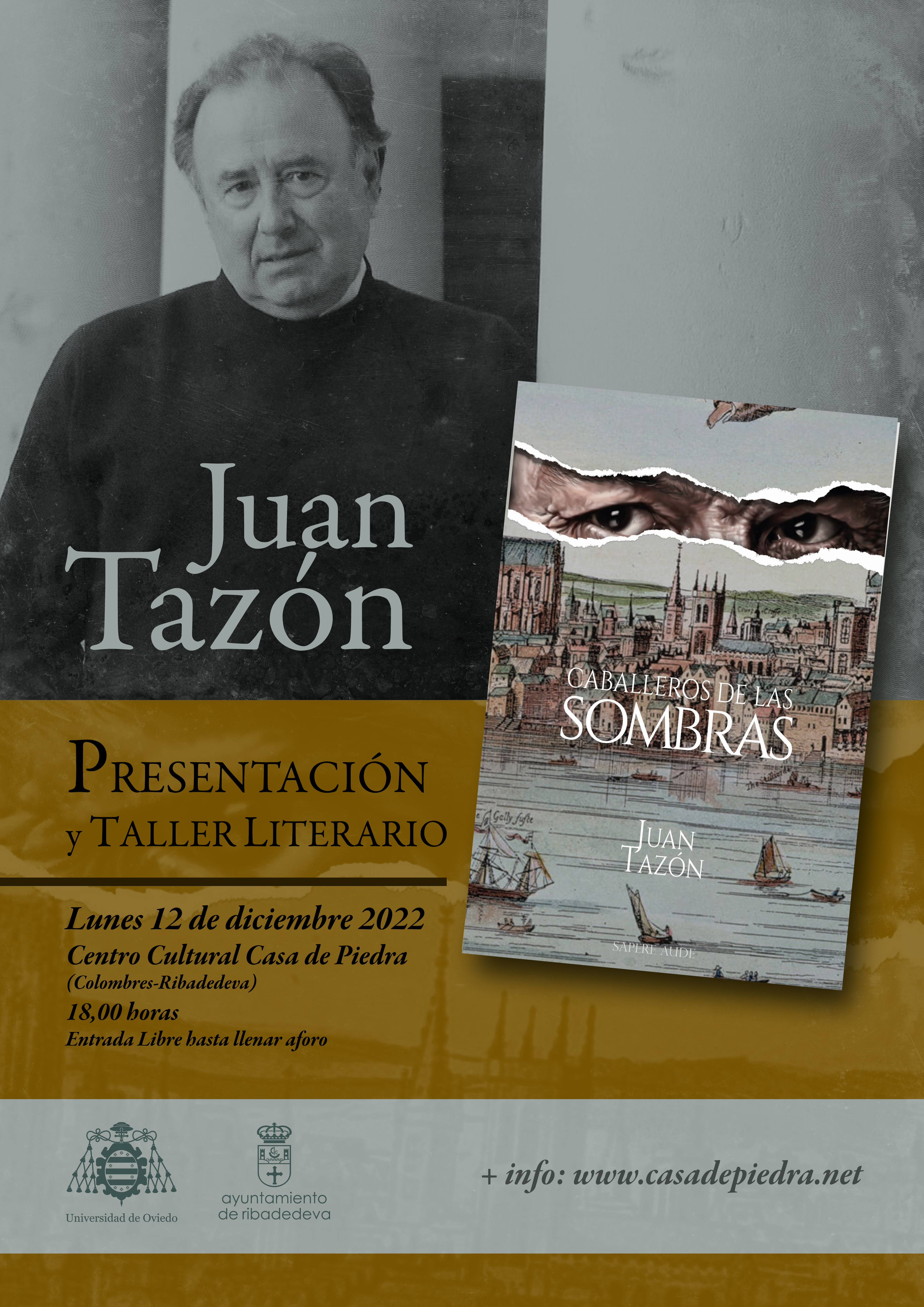 Dentro de las actividades de colaboración de Extensión Universitaria de la Universidad de Oviedo y el Ayuntamiento de Ribadedeva la Casa de Piedra acoge el próximo lunes 12 de diciembre a las 18,00 h. un taller literario y encuentro con los lectores del escritor y profesor de Filología Inglesa de la Universidad de Oviedo Juan Tazón en torno a su libro Caballeros de las sombras. La actividad tiene entrada libre hasta llenar el aforo.