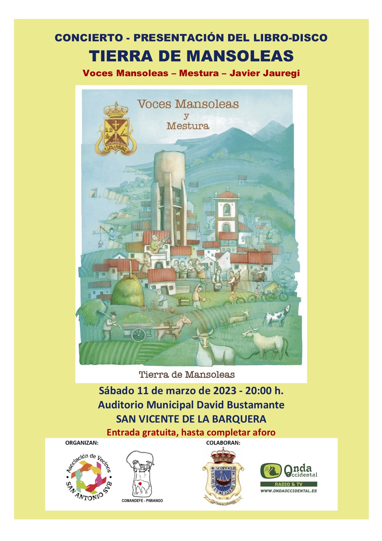 El próximo sábado 11 de marzo, en el Auditorio Municipal David Bustamante de San Vicente de la Barquera, tendrá lugar, a las 20:00h, el concierto de presentación del libro-disco “Tierra de Mansoleas”.
