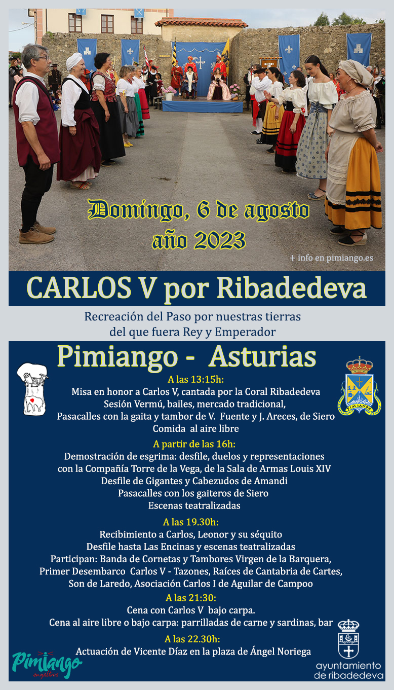 La localidad de Pimiango vuelve a conmemorar como cada año el paso del infante Carlos en el siglo XVI por el concejo. Por ello, el domingo 6 de agosto se escenificará como es habitual la llegada del príncipe, futuro rey y emperador, acompañado de su séquito. El acto consistirá en la representación y escenificación de la llegada de Carlos V a Ribadedeva, desfiles, recreaciones históricas y danzas. La actividad central comenzará a las 19:00 h. en el Palacio del Pedroso, luego se sucederán las diferentes actividades en distintos puntos de las calles y plazas de la localidad.