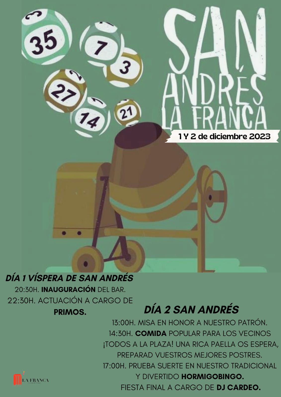 La localidad de La Franca está preparada nuevamente para celebrar los próximos 1 y 2 de diciembre de 2023 su fiesta otoñal, revitalizada hace algunos años por la Comisión de Festejos siguiendo la tradición de este pueblo de conmemorar esta celebración en honor del «glorioso San Andrés».