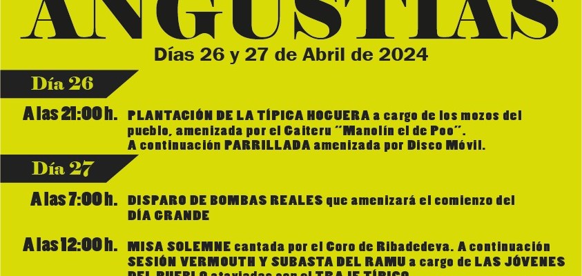 Como suele ser habitual cada año por estas fechas vuelven al calendario festivo del municipio las tradicionales Fiestas de Nuestra Señora de las Angustias de Villanueva. Con motivo de la celebración la Comisión de Festejos ha preparado un nutrido programa. Los días 26 y 27 de abril de 2024 podremos disfrutar de las diferentes actividades, entre las que no falta la plantación de la hoguera, la ofrenda del ramu o sus exitosas verbenas.
