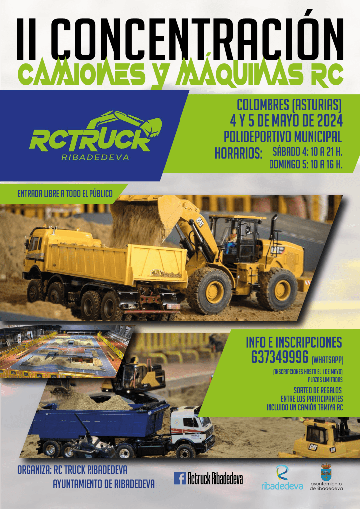 La Asociación de Modelismo RC Truck Ribadedeva con la colaboración del Ayutamiento de Ribadedeva ha organizado nuevamente una concentración de camiones y máquinas RC en el municipio durante los días 4 y 5 de mayo. Se trata de una exposición y uso en vivo de maquinaria de obra civil a escala 1.14 manejada mediante radio control. Para el desarrollo del evento se ha programado el montaje, al igual que la primera edición, de una maqueta en las instalaciones del polideportivo municipal con sus respectivas carreteras, casas, infraestructuras e instalaciones con el objeto de recrear una pequeña ciudad, por donde discurrirán los vehículos. El evento se celebrará dos días sábado día 4 de mayo de 10 a 21 horas y domingo 5 de mayo de 10 a 16 horas con entrada libre para todo el público aficionado que pretenda acudir a la actividad.