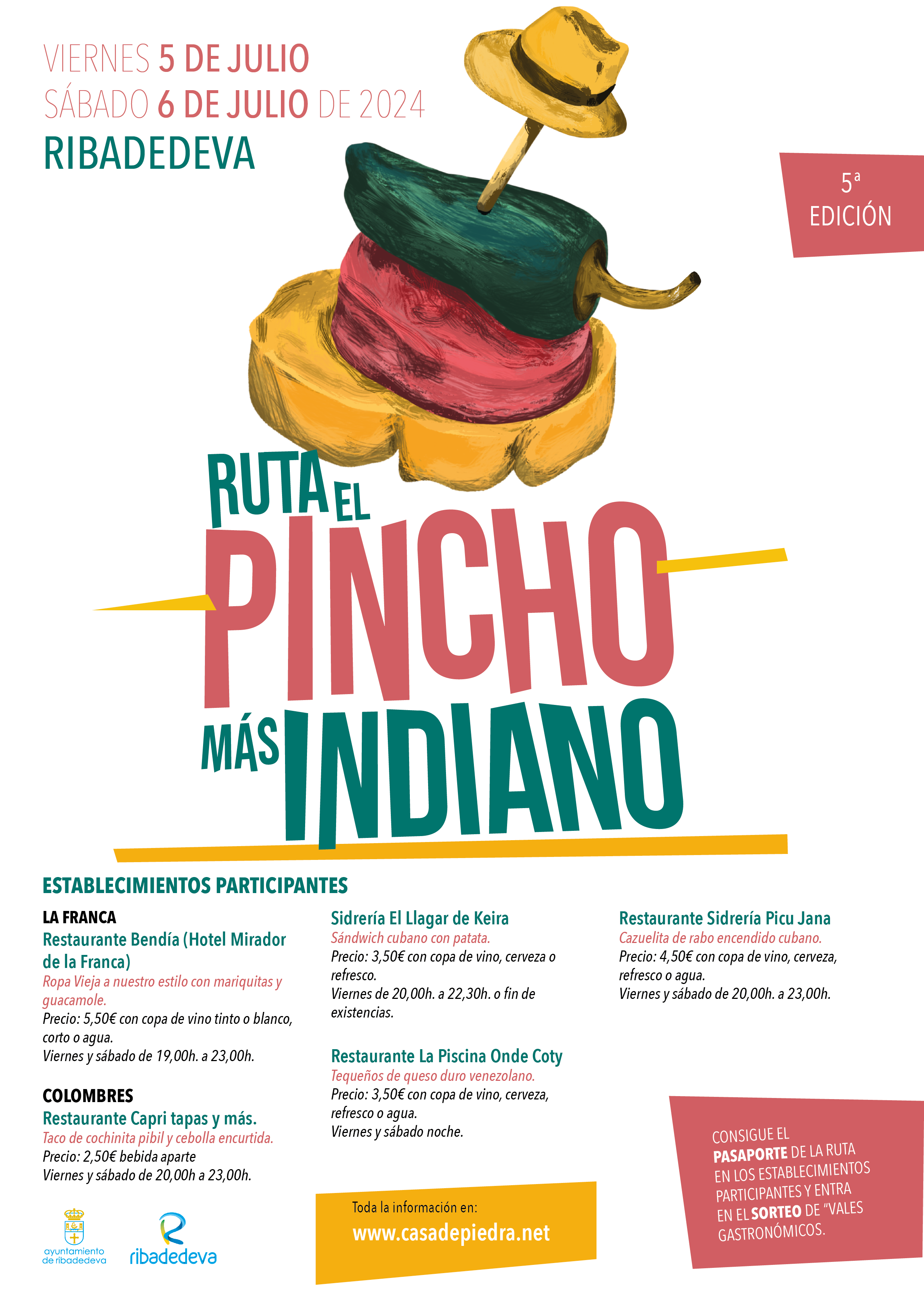 El Ayuntamiento de Ribadedeva y la Comisión Organizadora de la Feria de Indianos organizan conjuntamente con la hostelería local la ruta gastronómica “El Pincho más Indiano” los días 5 y 6 de julio de 2024 que este año llega a su quinta edición.