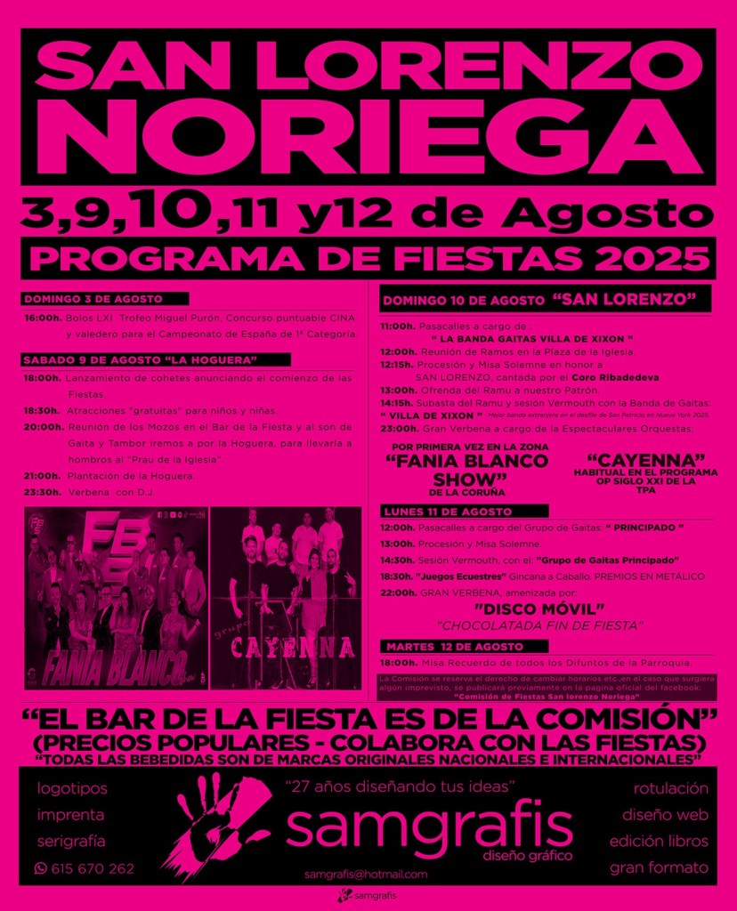 Como cada verano Noriega prepara la celebración de sus fiestas de San Lorenzo. Como viene siendo habitual la Comisión ofrece un amplio programa de festejos, para que todos podamos disfrutar durante los días 3, 9, 10, 11 y 12 de Agosto.