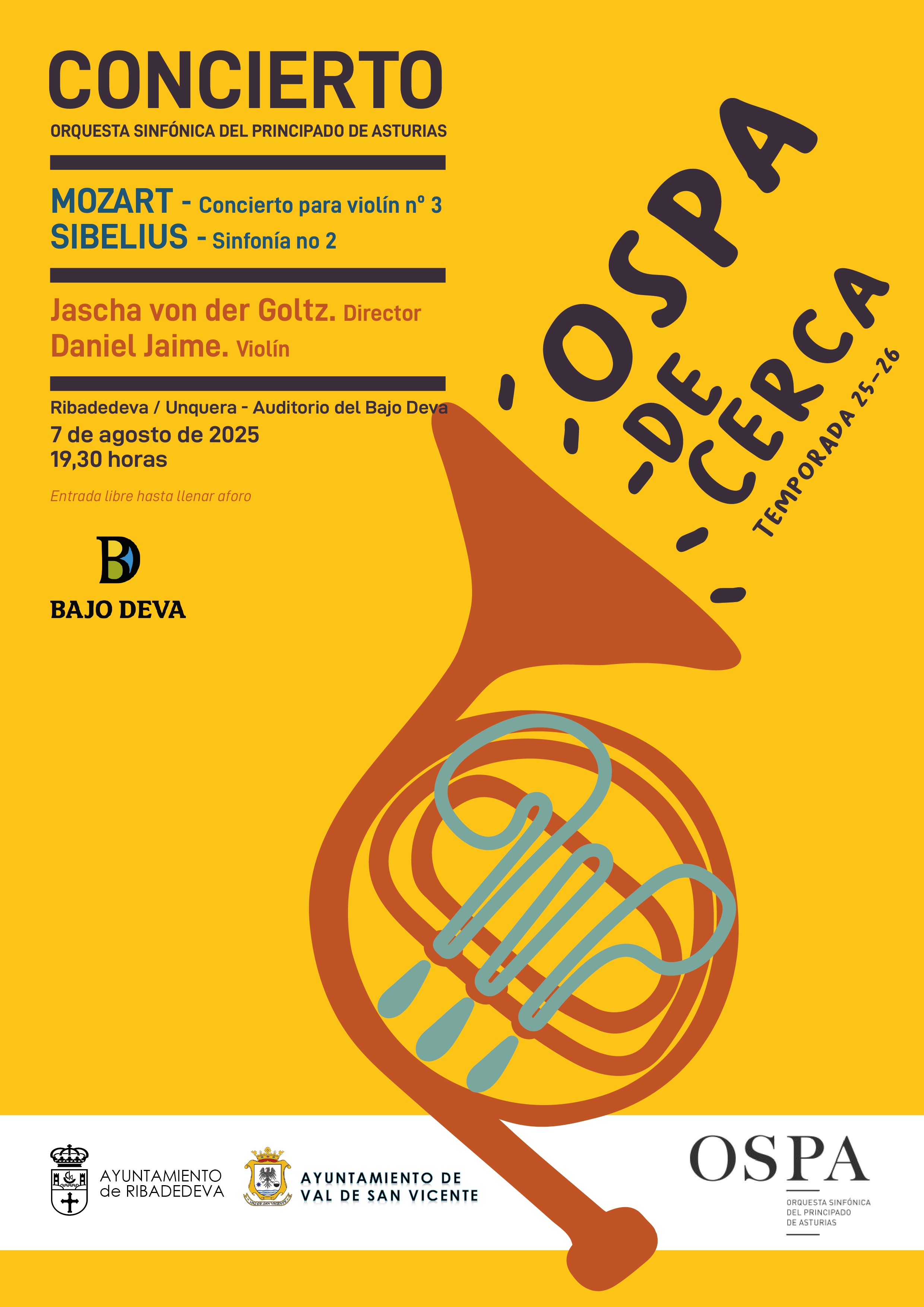 La Orquesta Sinfónica del Principado de Asturias (OSPA) ha incluido la comarca del Bajo Deva (Ribadedeva y Val de San Vicente) para su proyecto OSPA de Cerca. Se trata de un programa de conciertos que la orquesta ofrecerá en distintas localidades asturianas una vez finalizada su temporada de abono. Se da la particularidad de que en esta ocasión el proyecto da el salto de comunidad autónoma para actuar por primera vez en el Auditorio del Bajo Deva, espacio cultural que suele albergar programaciones culturales de los ayuntamientos de ambas orillas.