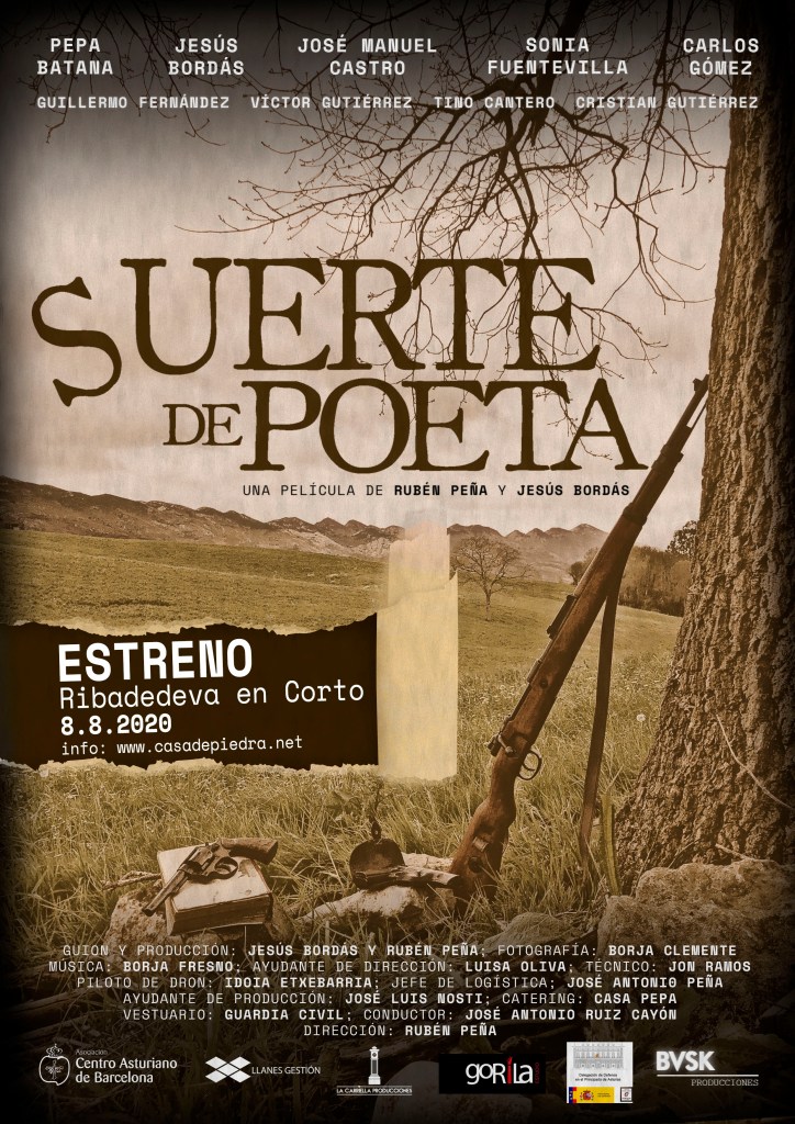 Dentro de la programación de nuestro festival Ribadedeva en Corto el sábado 8 de agosto a partir de las 22,00 h. (habrá un pase a las 22,00 h. y otro a las 23,00 h. con entrada de 2 euros por sesión) la carpa situada en los jardines del Archivo de Indianos acogerá la premiere del cortometraje Suerte de Poeta, dirigido por Rubén Peña y escrito por éste y Jesús Bordás. Una historia rodada en Ribadedeva con la colaboración e interpretación de algunos vecinos del municipio. La película, de poco más de 20 minutos de duración narra la historia de una Ribadedeva de posguerra en donde sus protagonistas, Gonzalo, Marina, Ricardo y Manuel cruzan sus historias en las que se entremezclan la lucha por la libertad, el amor o el honor y el deber.