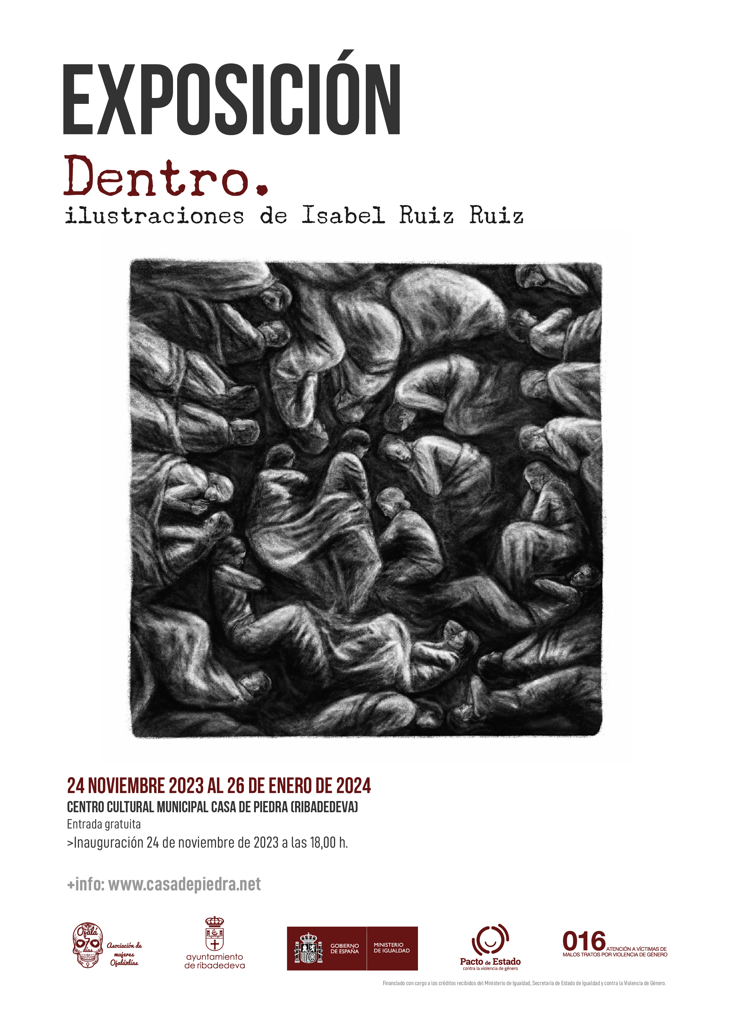 La presente exposición recoge un total de 24 láminas con una selección de las ilustraciones que Isabel Ruiz ha realizado para su libro DENTRO, publicado en el año 2022. La novela gráfica -que cuenta con una segunda parte ya editada y una tercera en preparación- recoge con un particular formato de álbum diferentes textos literarios y testimonios sobre las penosas condiciones de vida de las mujeres en las cárceles franquistas. Unos dibujos realizados por la autora de forma sencilla y expresiva acompañan gráficamente los textos. Isabel Ruiz opta en esta ocasión por la utilización del blanco y negro a través del carboncillo,”lo que pemite un contraste mayor y una riqueza de texturas”. A través de la ausencia de color las ilustraciones monocromas pretenden recrear el “ambiente opresivo” en el que se desarrolla la obra.