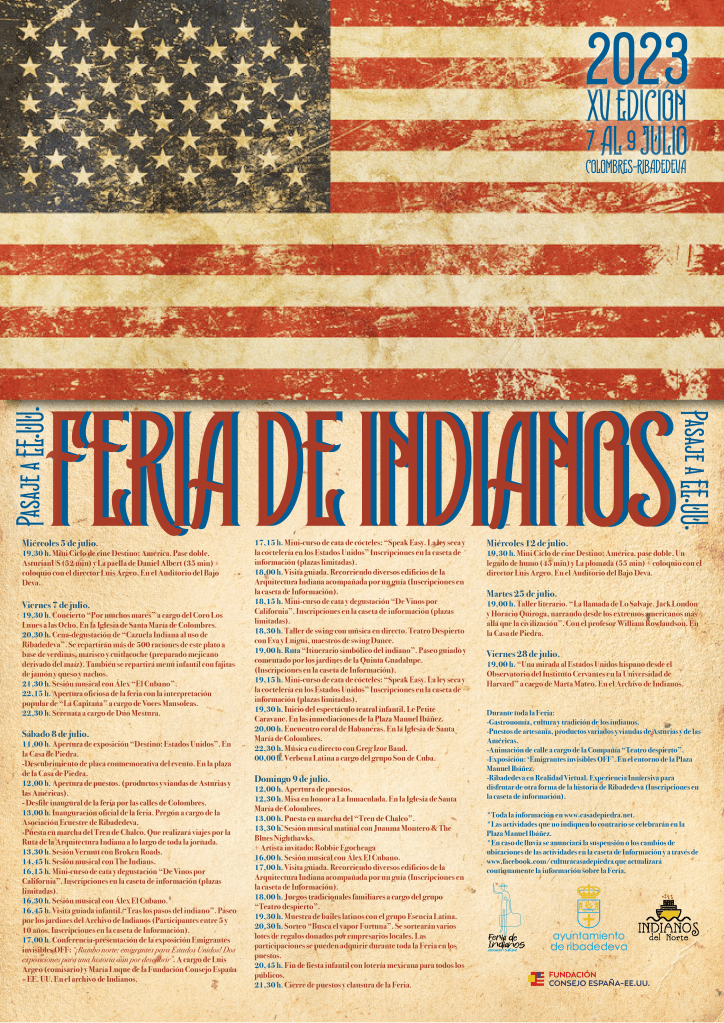 La Feria de Indianos se dedica a de forma especial a EE. UU. y como siempre disfrutaremos de gastronomía, música y tradiciones, teatro, animación de calle, presentaciones, conferencias, talleres, juegos… En esta página puedes consultar todo el programa que hemos preparado y descargártelo en PDF para llevarlo en tu dispositivo móvil